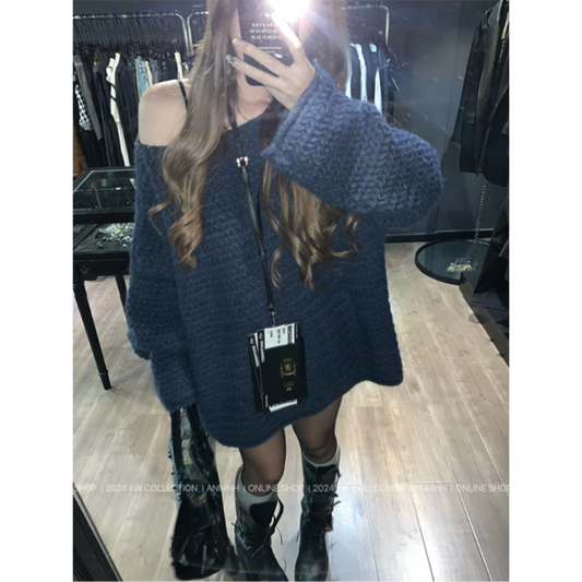 LF ニット 斜め肩セーター グレー&ダークブルー オシャレ かっこかわいい Anne