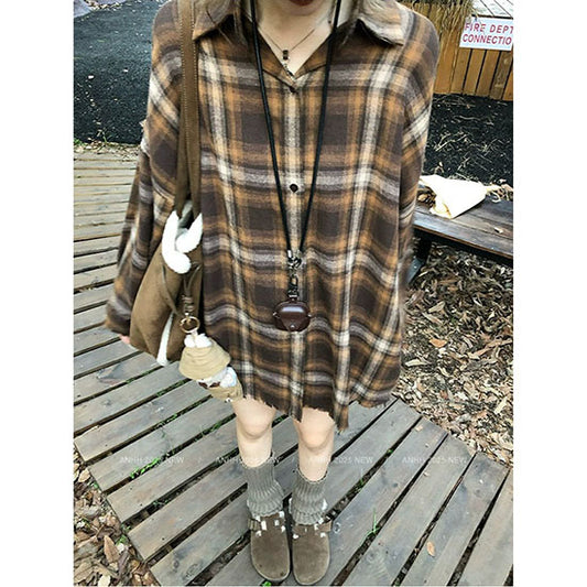 LF レトロ チェック柄 長袖シャツ ゆったり ニットカーディガン セーターコート 着痩せ