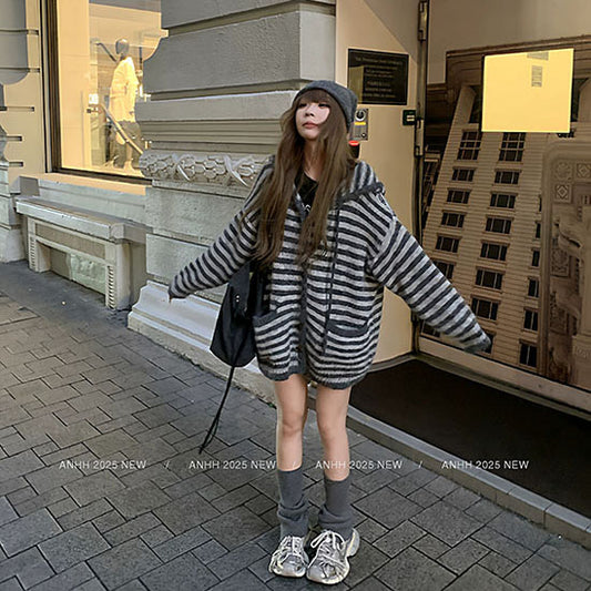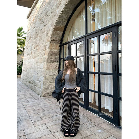 LF ふわふわ ゆったり ニットカーディガン セーターコート & ボーダーニットカジュアルパンツ