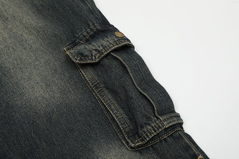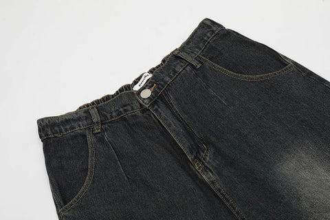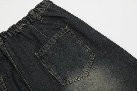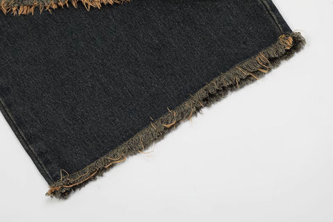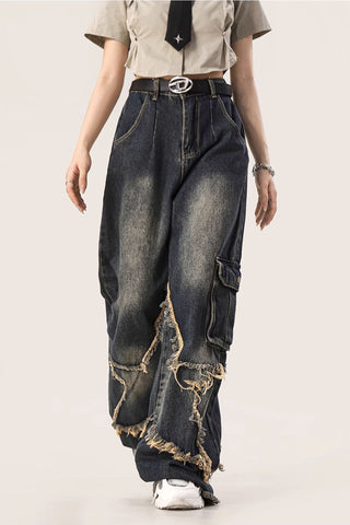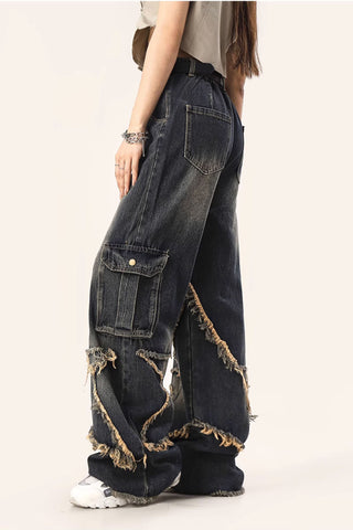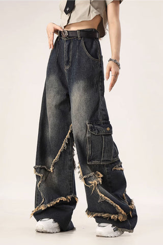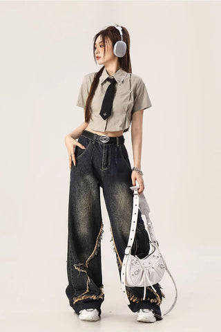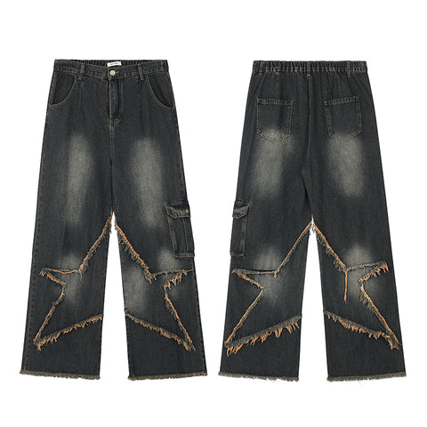 LF04 アメリカン フリンジ星柄ワイドジーンズ ハイウエスト バギーパンツ オシャレ