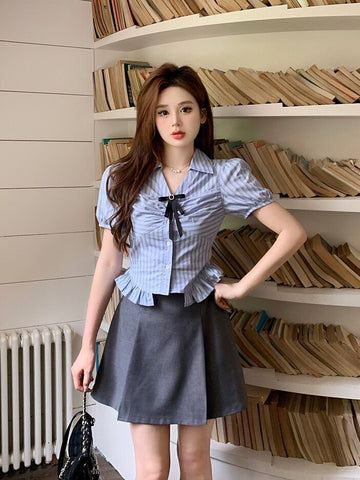 XYW 縦縞レースシャツ + グレーミニスカート/ロングスカート セット 純欲風