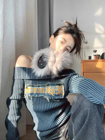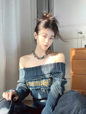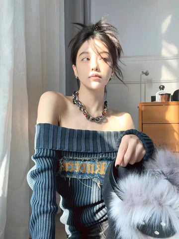 XYW 秋新作 オフショルダーネック ニット セーター 純欲風 ギャル 着やせ
