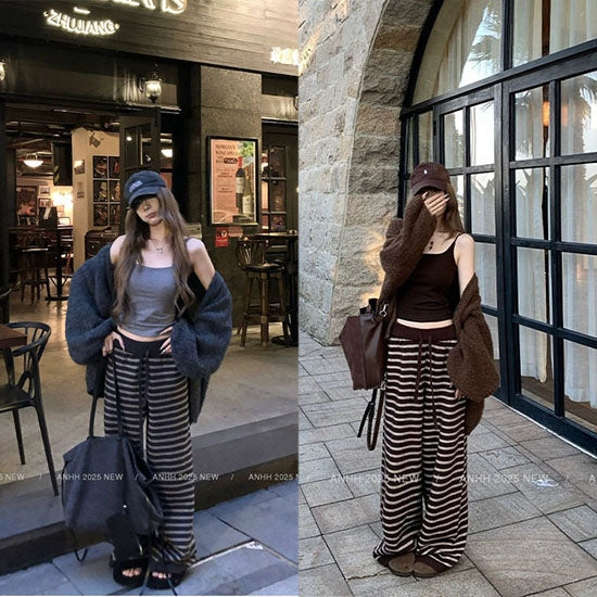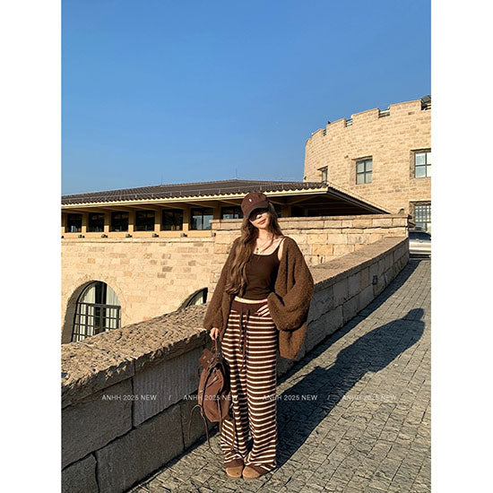 LF ふわふわ ゆったり ニットカーディガン セーターコート & ボーダーニットカジュアルパンツ