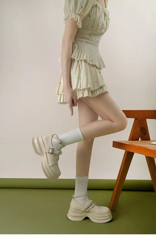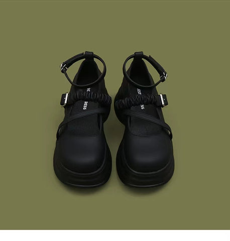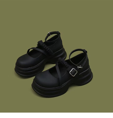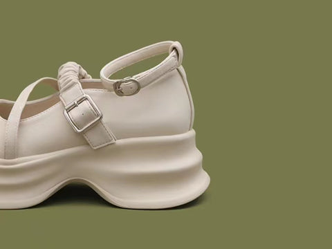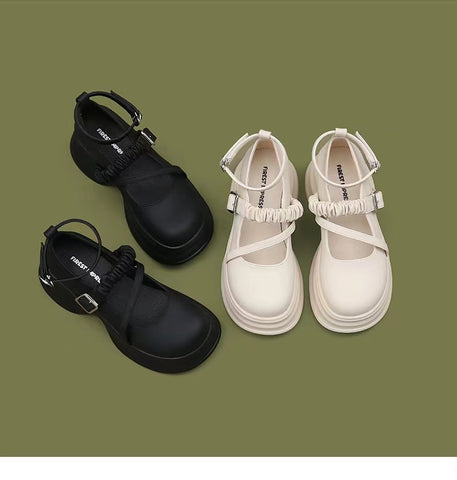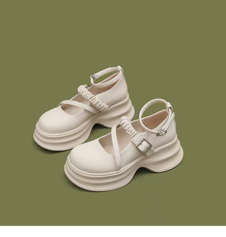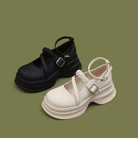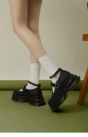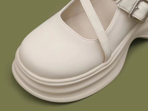 LF02 かわいい メリージェーン ゴムひも 厚底シューズ ホワイト/ブラック