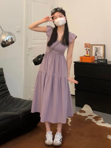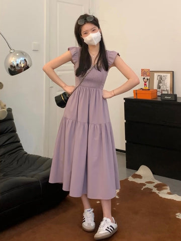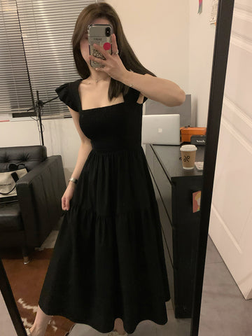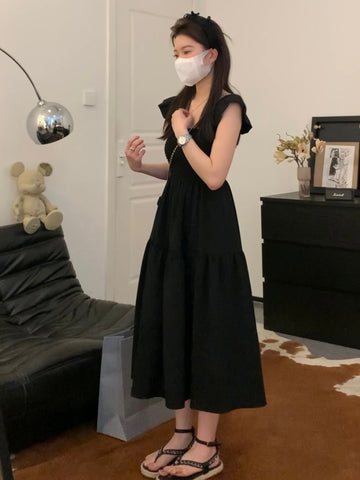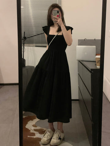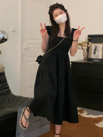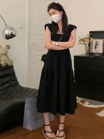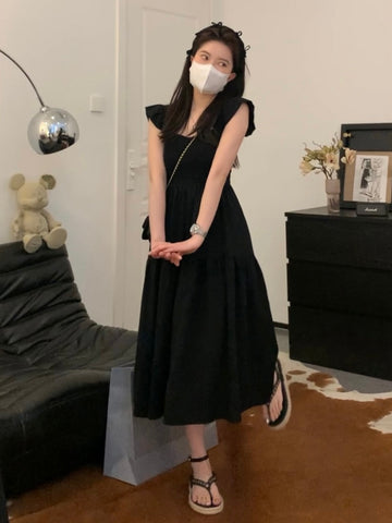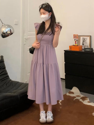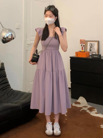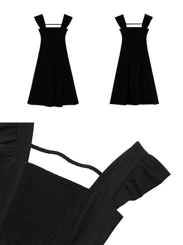 XYW 予約 スクエアネック ふりふり ワンピース ブラック/パープル 着やせ キャミワンピース