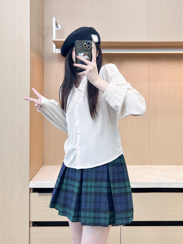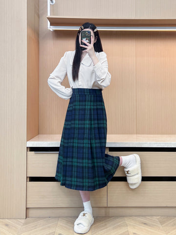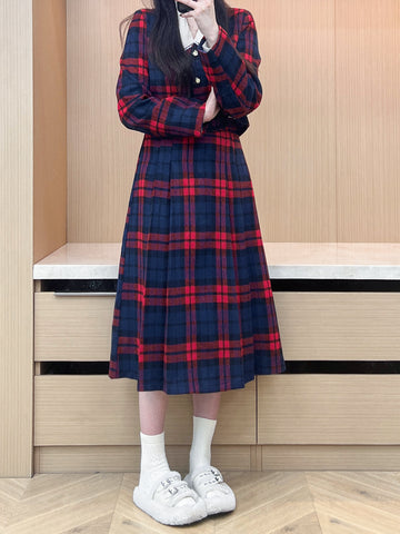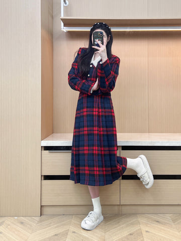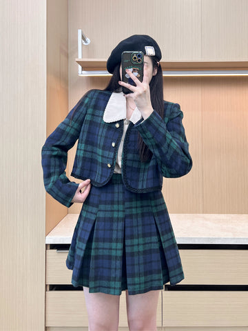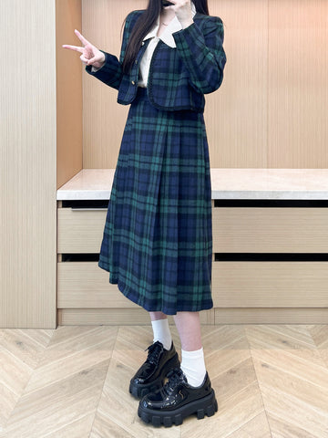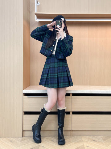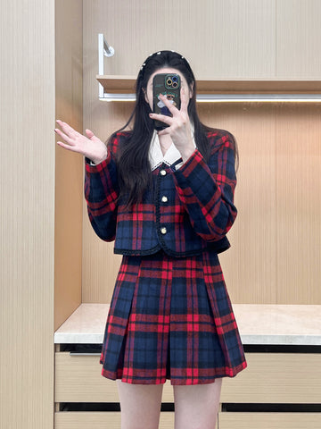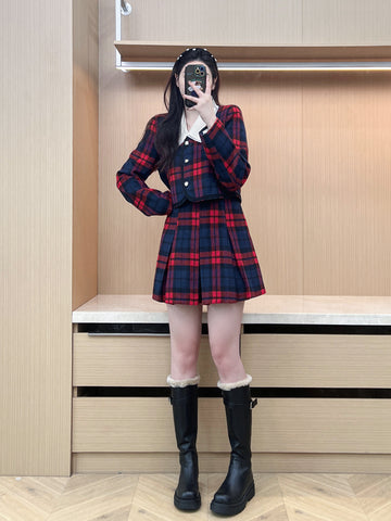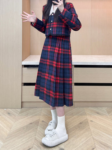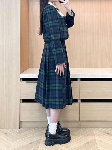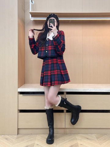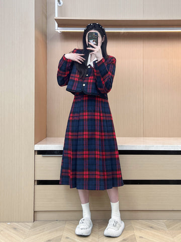 XYW 予約 着やせ レトロスタイル チェック コート + プリーツスカート + シャツ