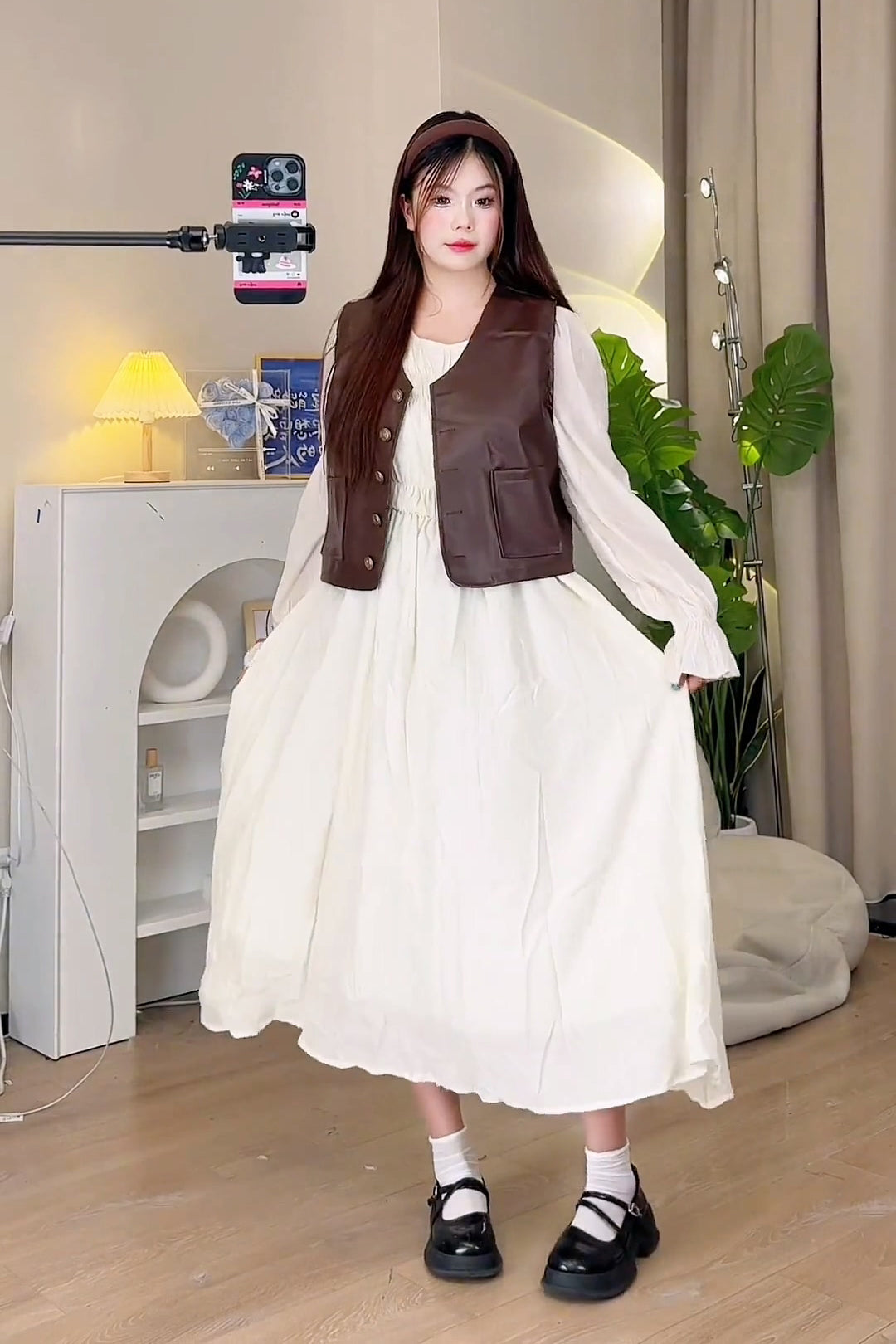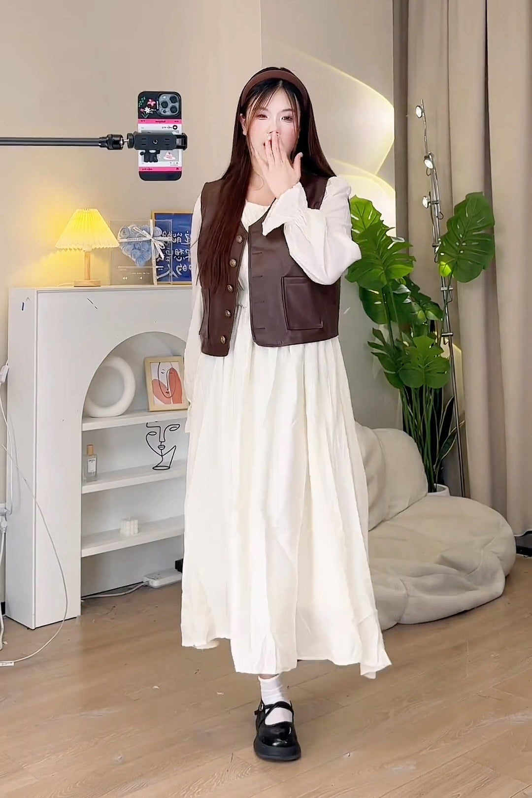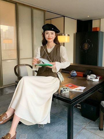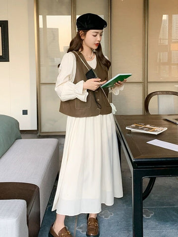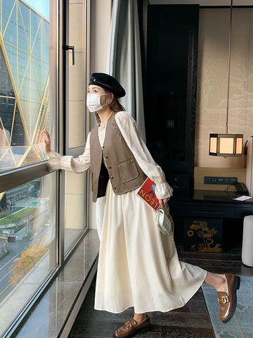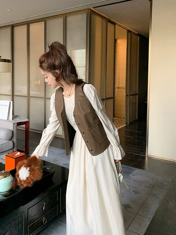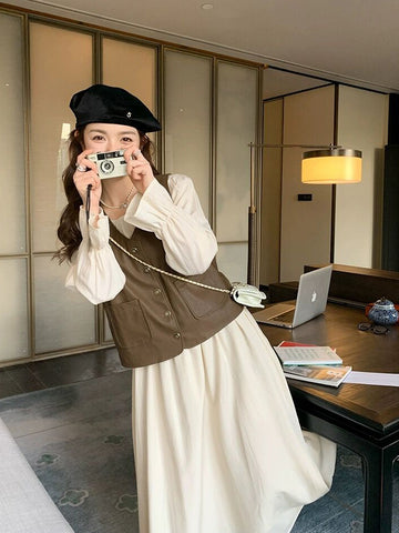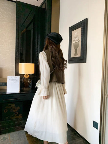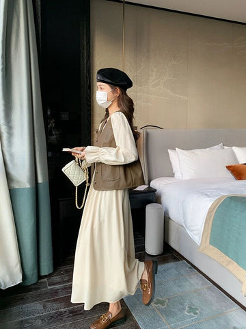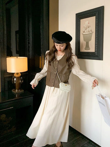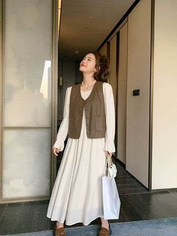 XYW 2023新作 アイボリー 長袖 ワンピース + ブラウン ベスト セット