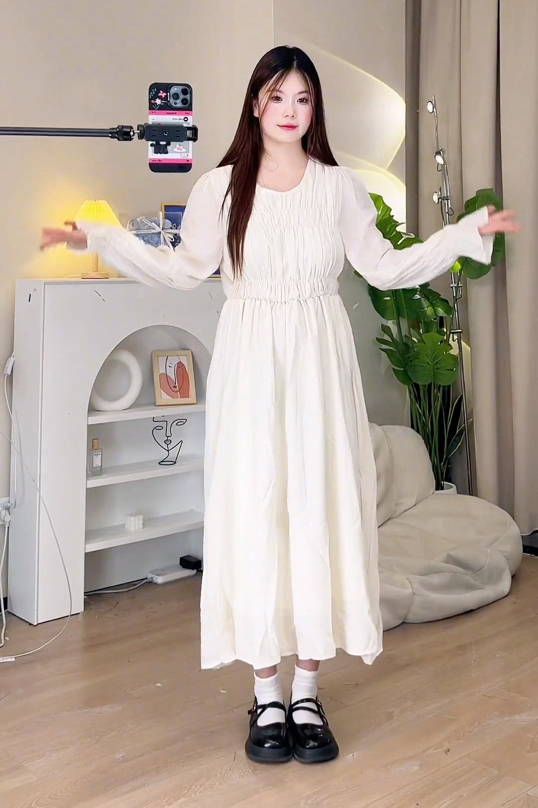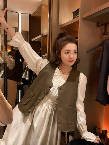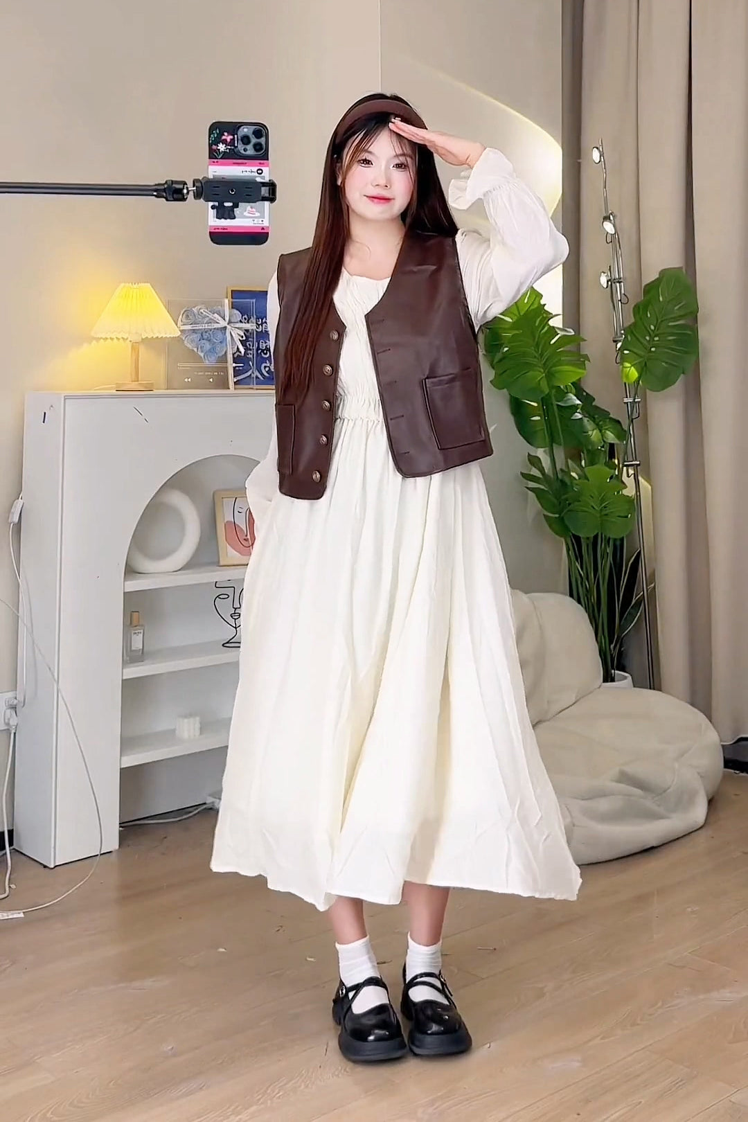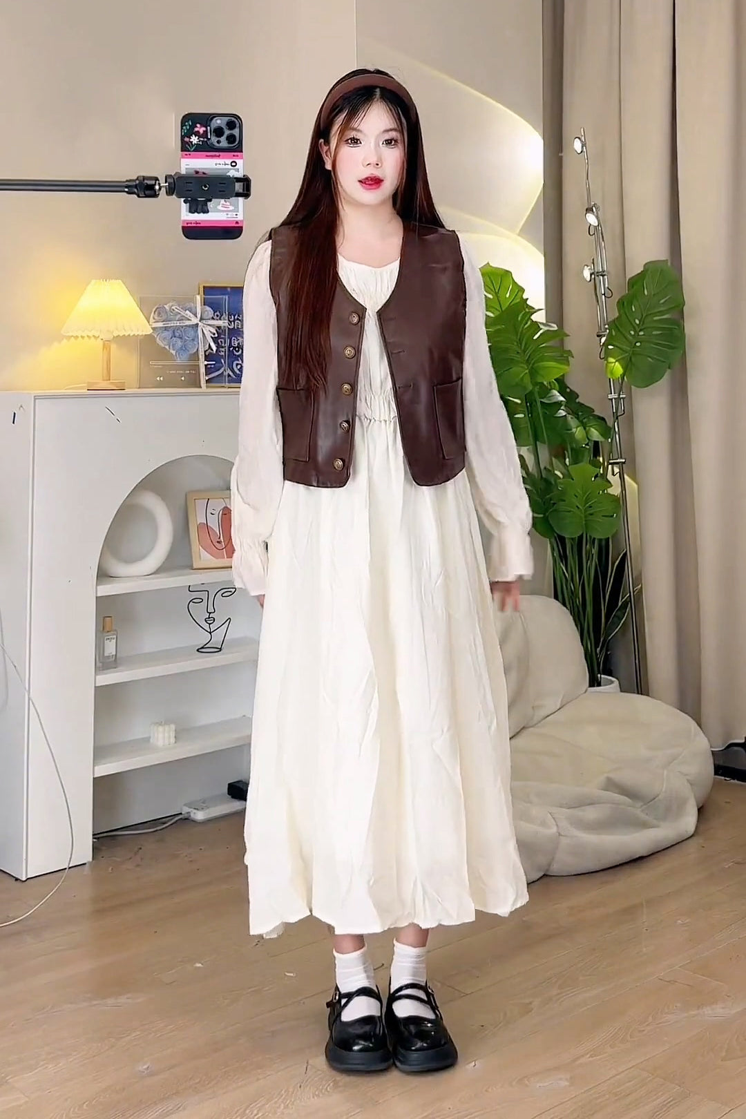 XYW 2023新作 アイボリー 長袖 ワンピース + ブラウン ベスト セット