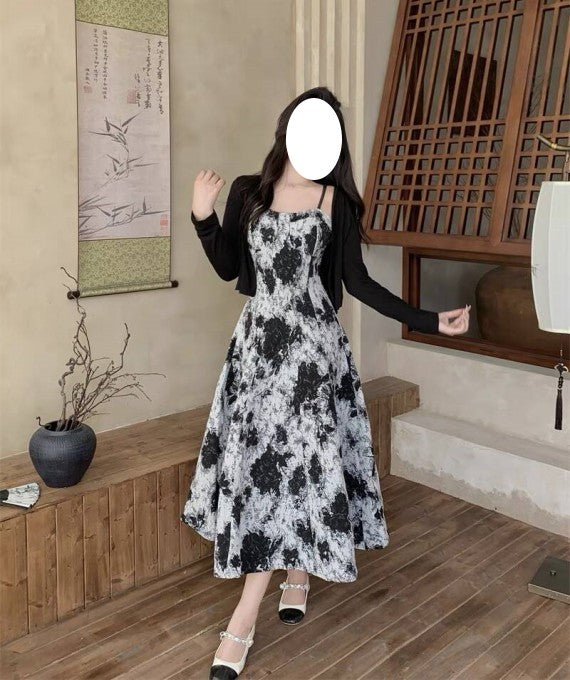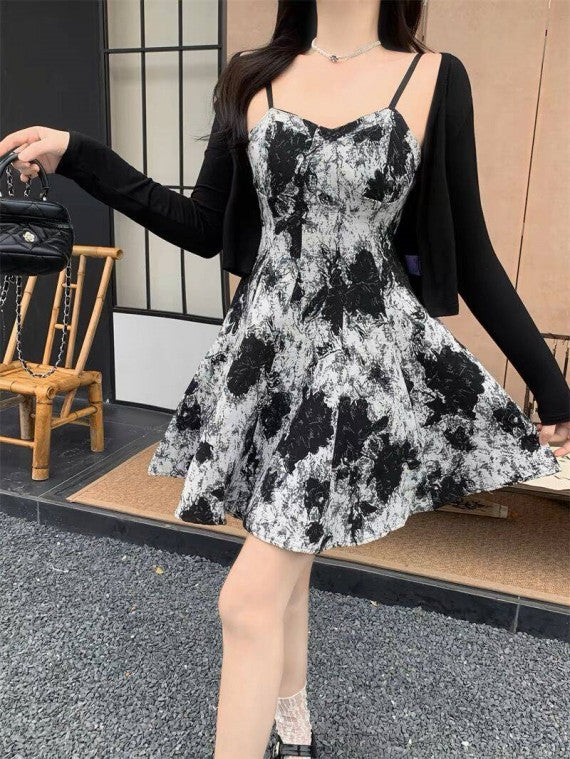 キャミソールワンピース ウエストシェイプで着痩せ ショートタイプスカート カーディガンセット(X9)