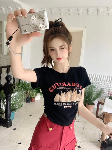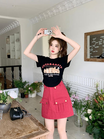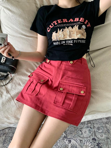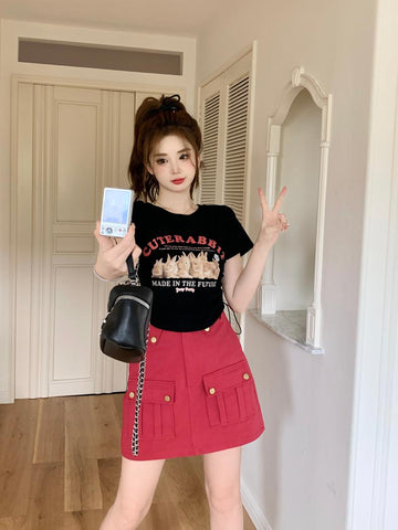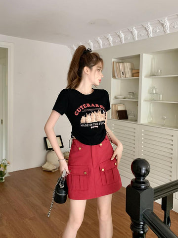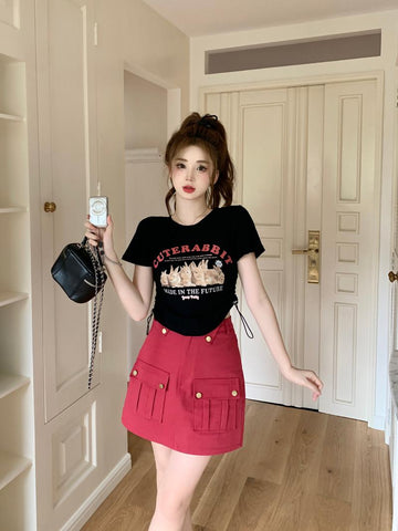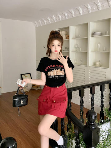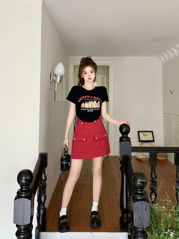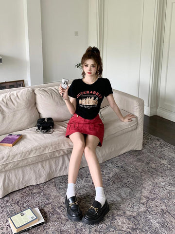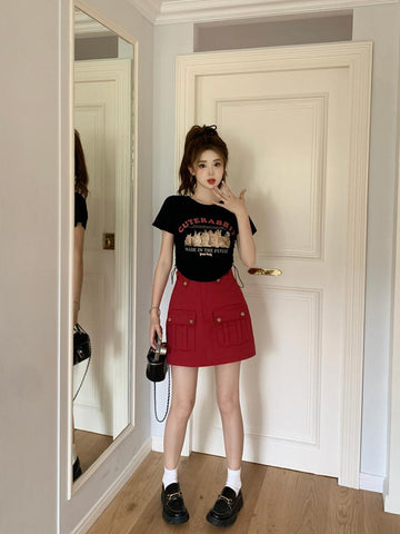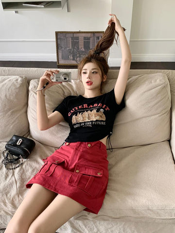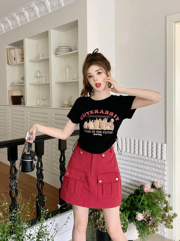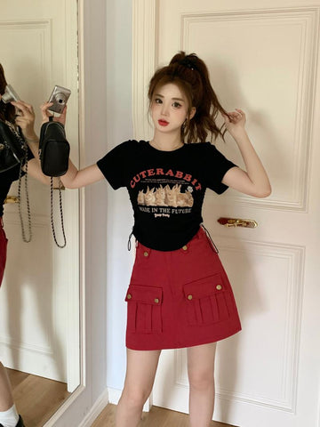 【予約】XYW ドローストリング ギャザー ブラッククロップド Tシャツ + レッドスカート セット ギャル