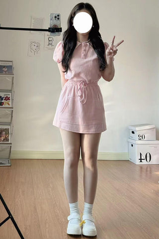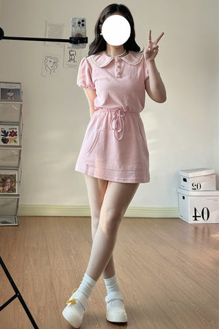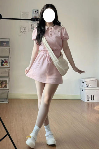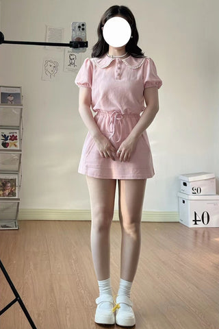 【予約】XYW ピンク 折り襟 ショートトップス + ショートスカート セット 可愛い カジュアル