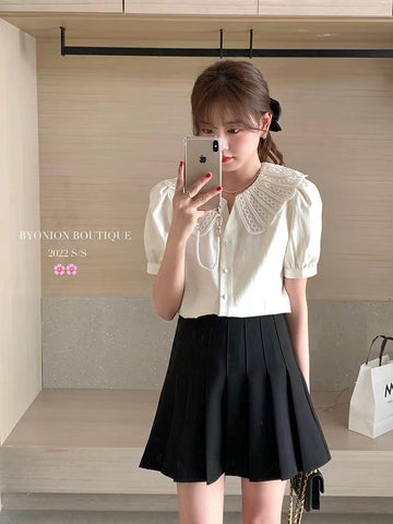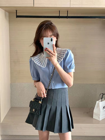 XYW 春と夏新作 レースブラウス シャツ ショートトップス + プリーツスカート