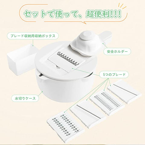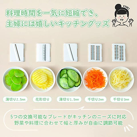 - 【一台多役、様々なニーズに応じる】このスライサーは5つのブレードがあるので、プレートを取り替えるだけで、千きり、ツマ切り、スライス、薄切り、しわなどのバリエーションを実現可能です。また、生姜、ニンニク、キャベツ、大根、レモンなど、様々な食材に幅広く使えます。多くのニーズに合わせて、楽しく料理できます。