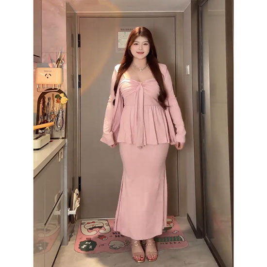 LF フリル付きピンクトップス 3点セット フェミニン 体型カバー ロング丈