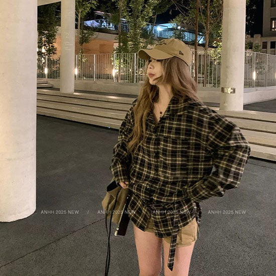 LF ベルト付き オーバーサイズ チェックシャツ 長袖 韓国風 カジュアル レディース