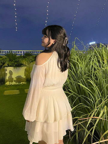 XYW エレガント アイボリー ふりふり オープンショルダー 長袖 ワンピース ティアードスカート
