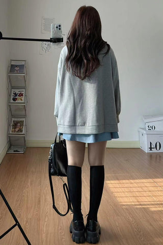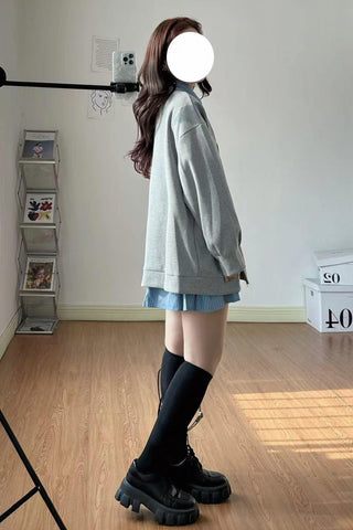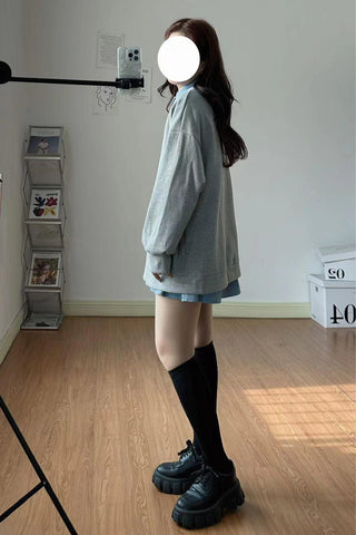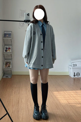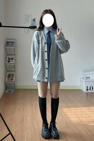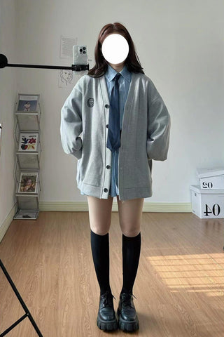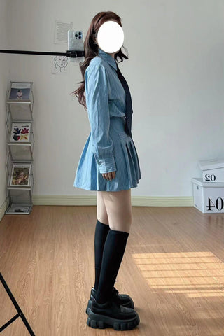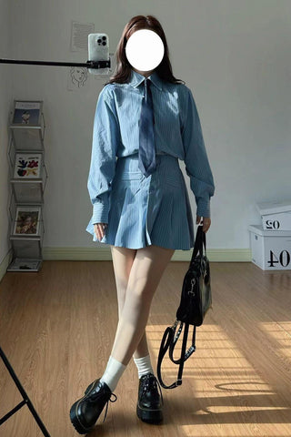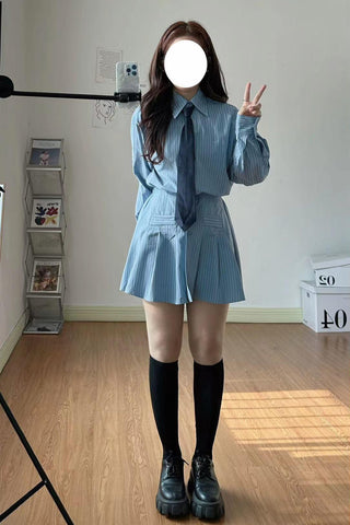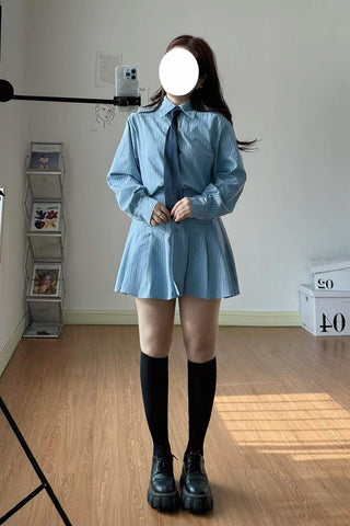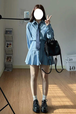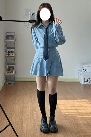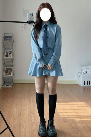 XYW 長袖 ストライプ シャツ ワンピース + ネクタイ + グレーカーディガン セット