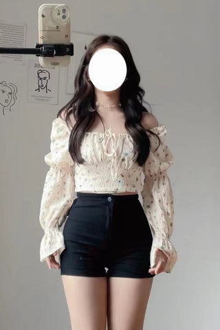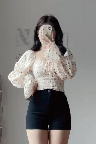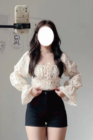 XYWA06 イエロー花柄 スクエアネック 長袖 ショートトップス