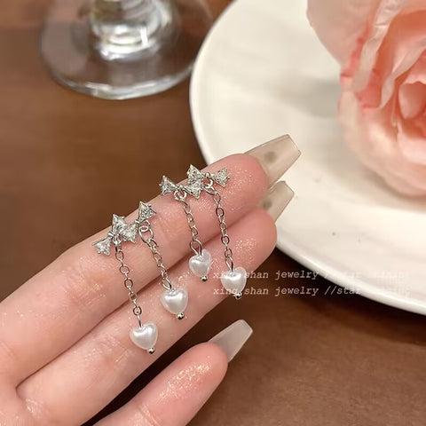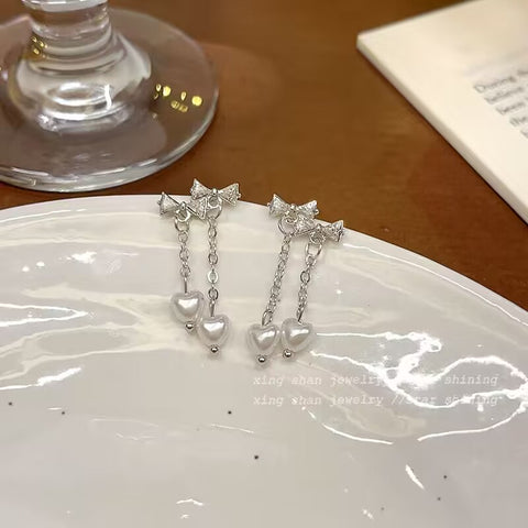YQQ 高級感 キラキラ 二重リボン ハートパール フリンジピアス